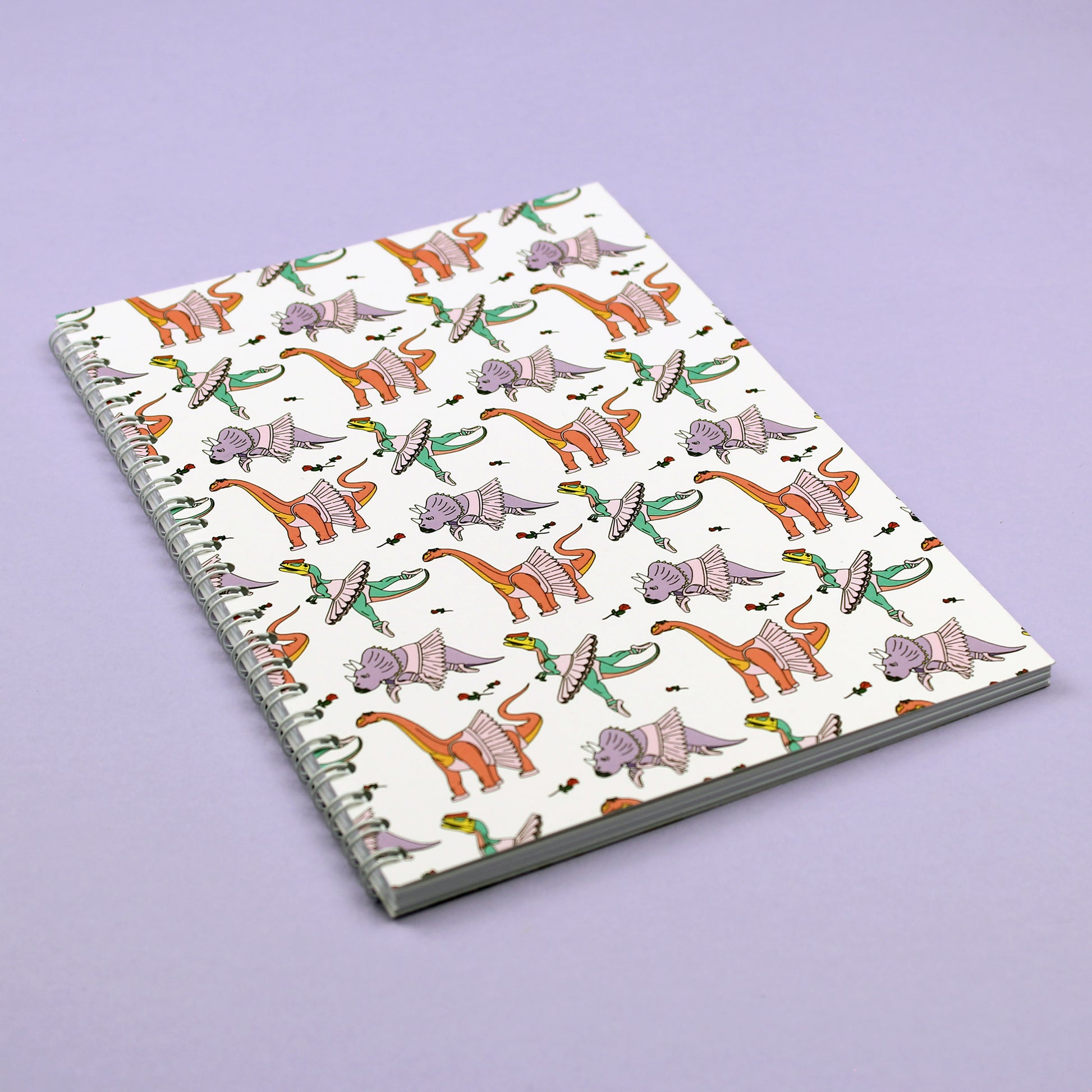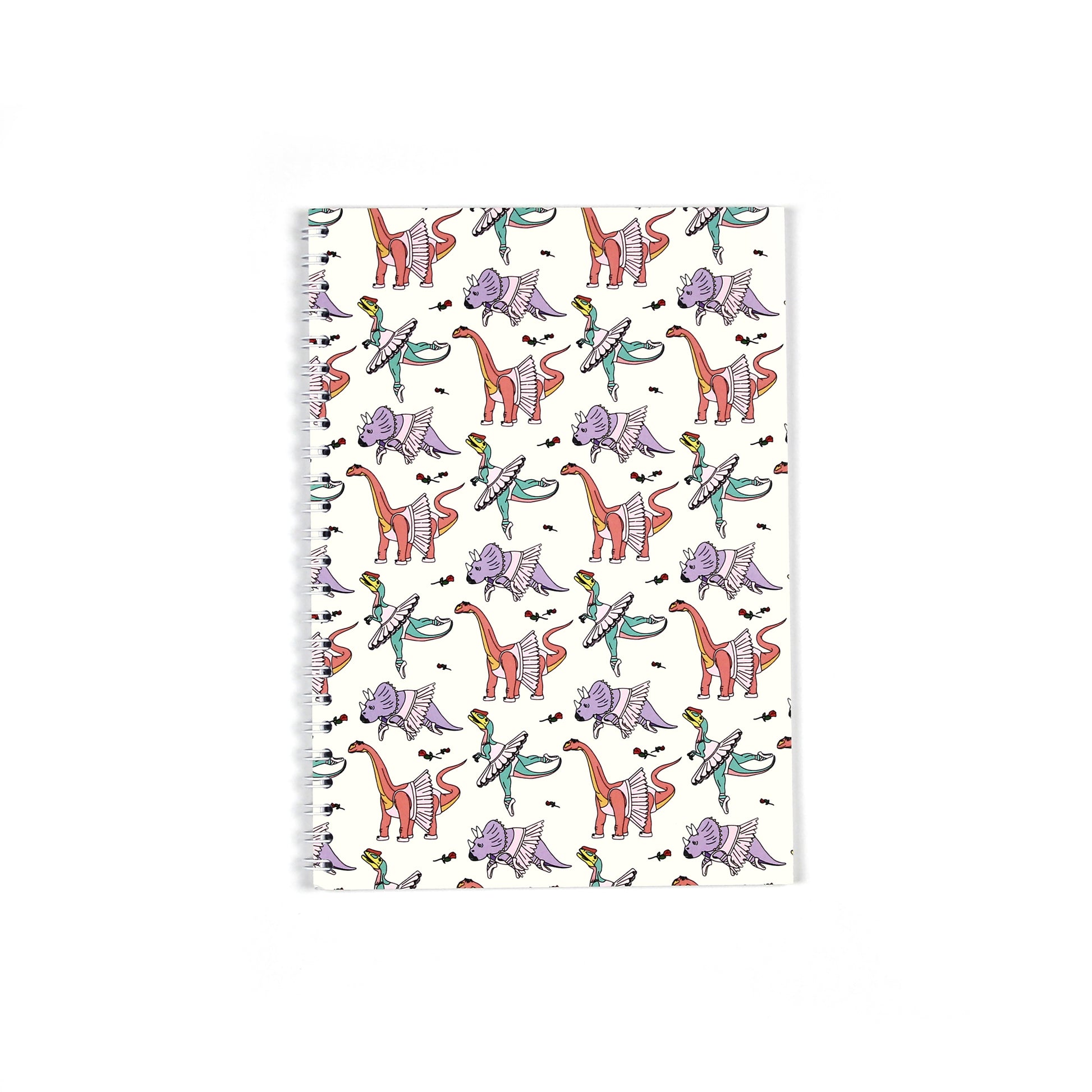 These notebooks feature 3 dinosaurs (triceratops, vulcanodon and kileskus) dressed in pink tutus and leotards with scattered roses around them. The front and back covers have the ballet dinosaur pattern and the inside covers are plain.
