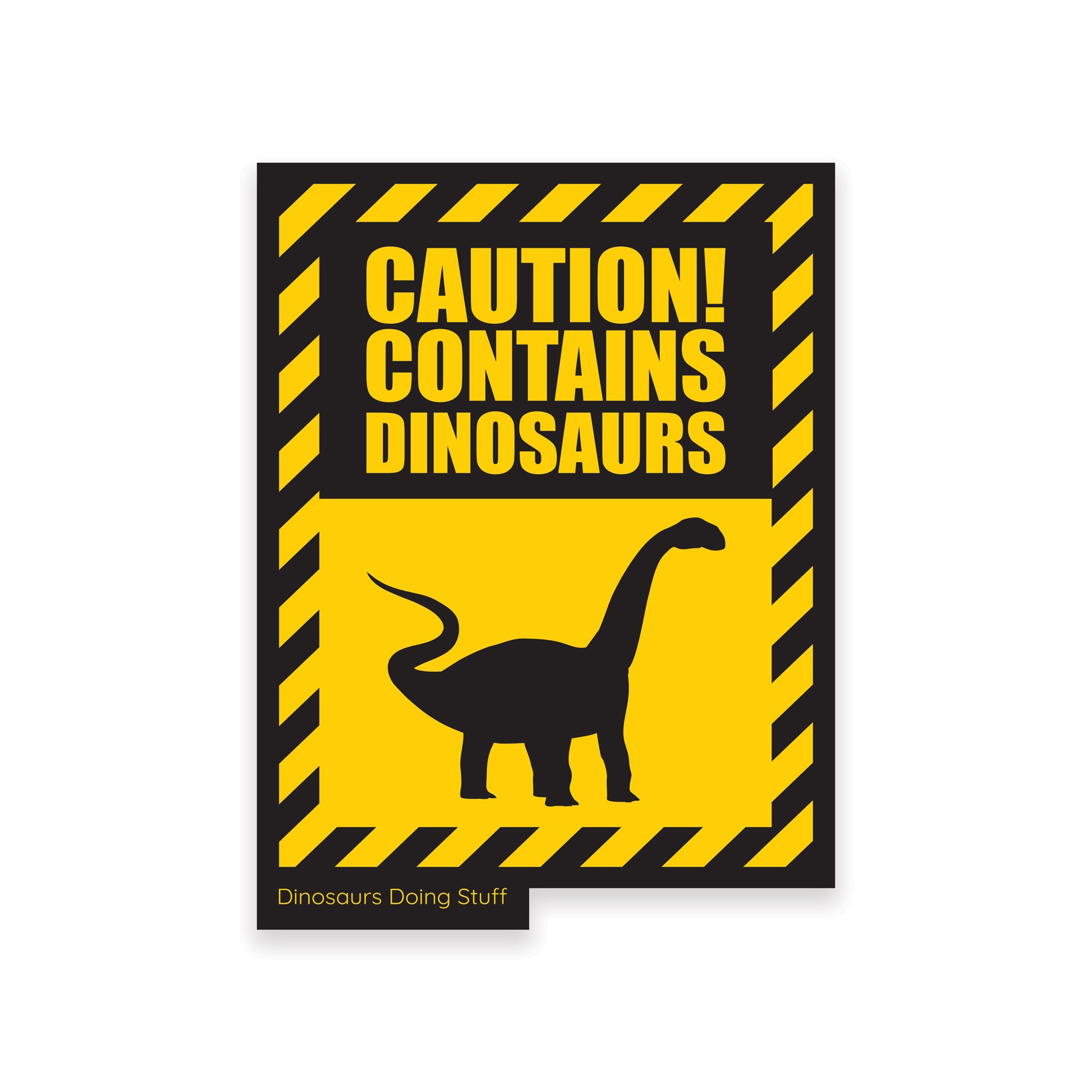 Featuring a bright yellow and black design, a diagonal stripe border, text that says 'CAUTION! CONTAINS DINOSAURS', and a black Vulcanodon below the text.