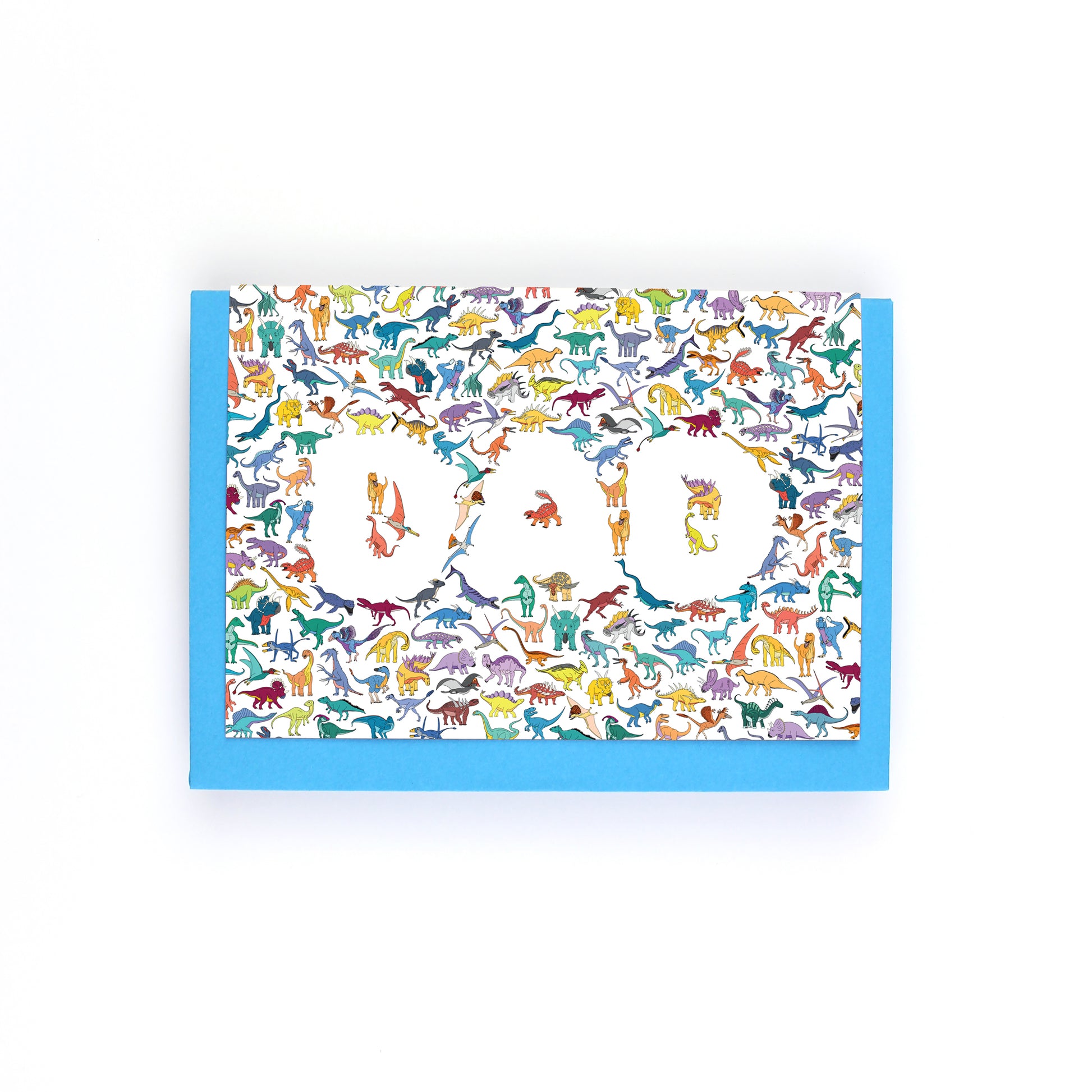 The card features over 100 tiny dinosaurs (flying reptiles, swimming reptiles and other reptiles) arranged so the white space spells 'DAD'. This card is exceptionally detailed but very simple.
