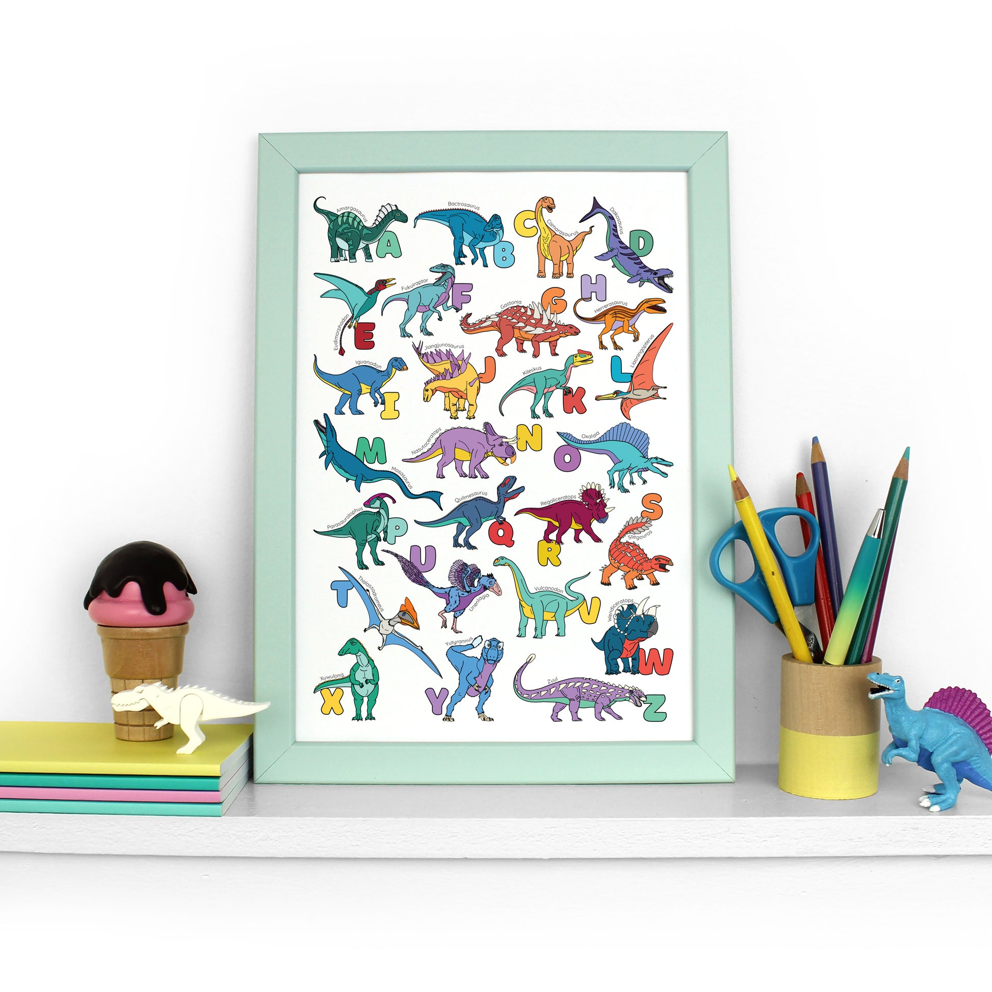 This super cute and colourful A-Z of Dinosaurs print is perfect for dinosaurs lovers. The design features an entire alphabet of dinosaurs, marine reptiles and pterosaurs that all lived in prehistoric times. Each dinosaur is digitally drawn and labelled so you can identify the dinosaurs quickly.
