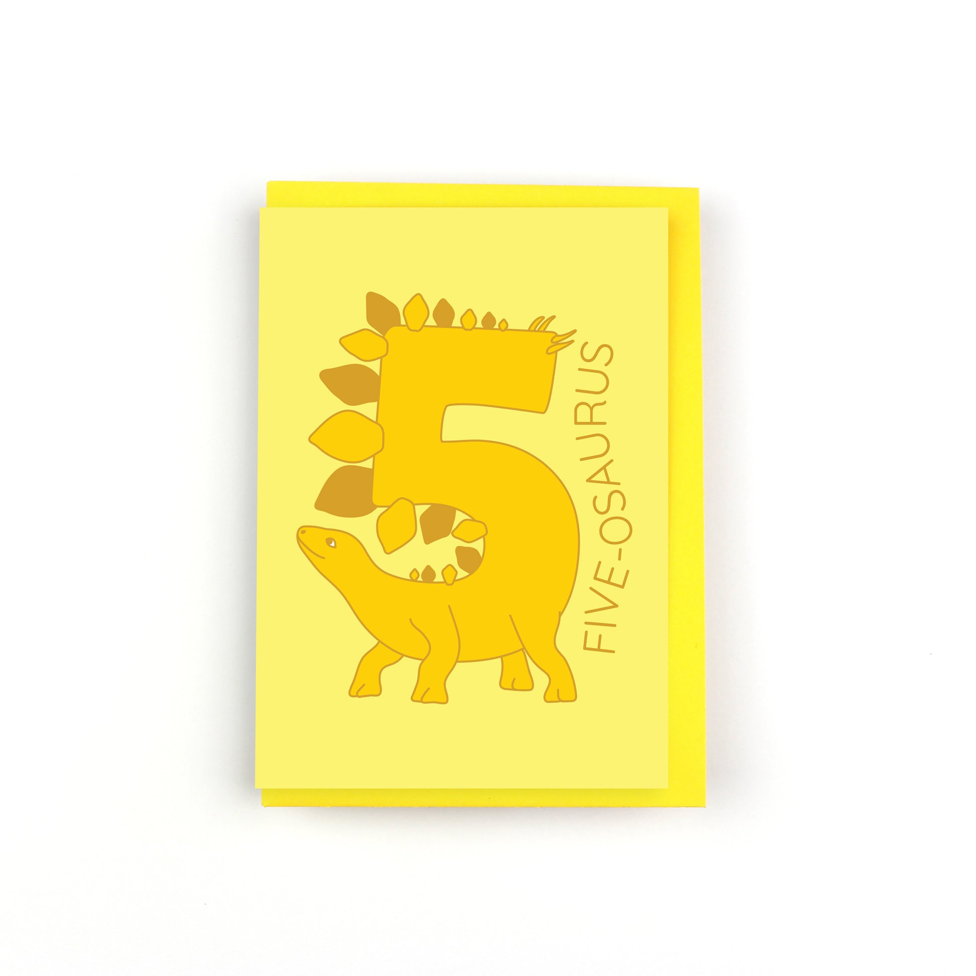The card features a yellow number three shaped like a stegosaurus. Going up vertically next to the number is the text 'FIVE-OSAURUS'. The card has a yellow background.