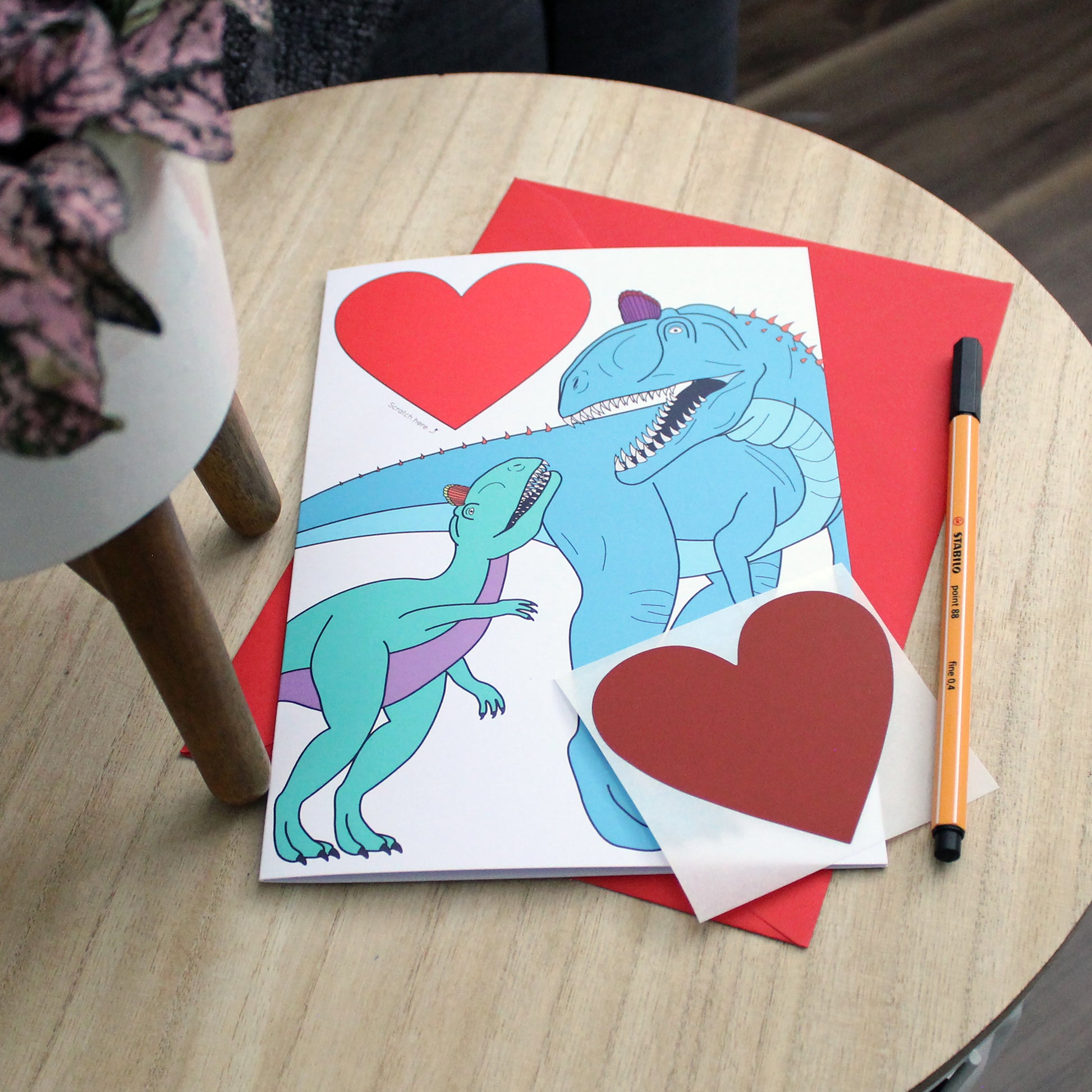 This card would make a great birthday, Valentine's, Mother's or Father's day card. It features a large blue cryolophosaurus looking down at a smaller green juvenile cryolophosaurus. There is a large red heart to write a message on before covering it with the scratch sticker in the colour of your choice. The design wraps around the card showing their tails on the back of the card
