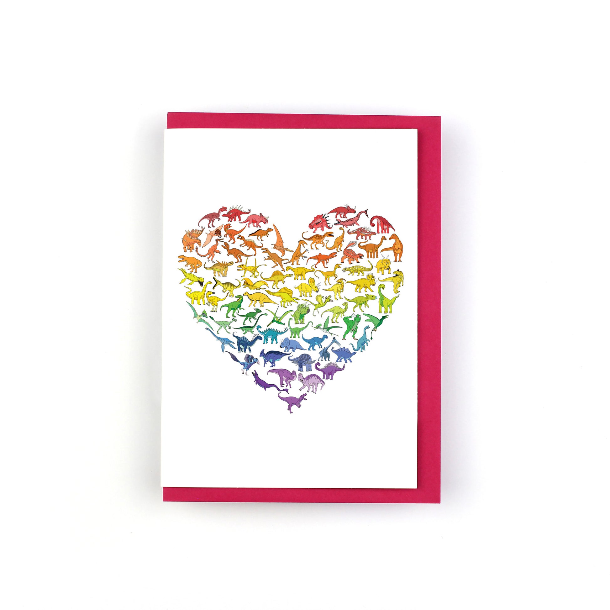 The card features a heart made of tiny dinosaurs. The dinosaurs have been recoloured so there are lines of red, orange, yellow, green, blue and purple dinosaurs. Each dinosaur has been perfectly positioned to create a heart shape.