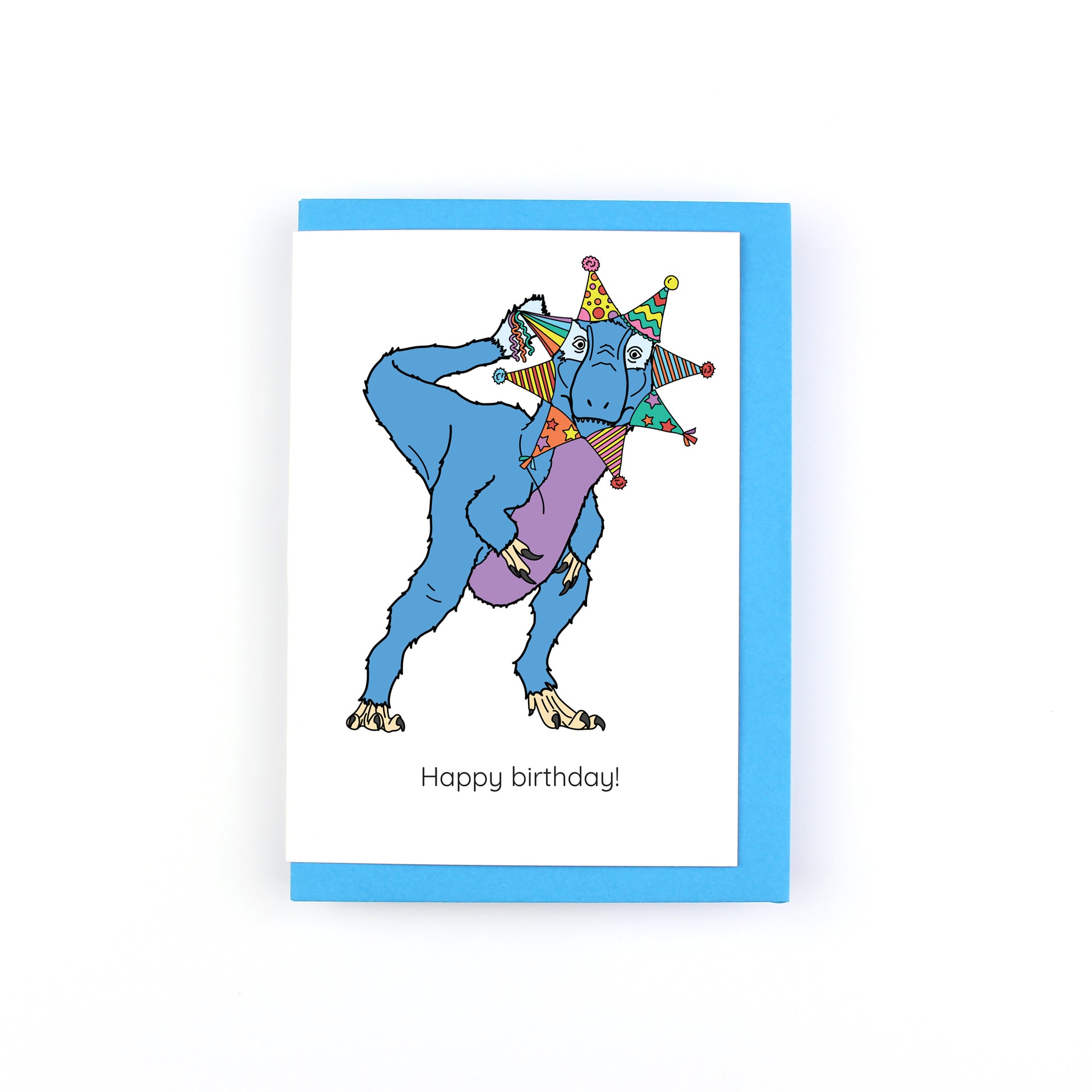 The card features a blue and purple Yutyrannus with party hats around its head in a circle. The text below reads 'Happy Birthday'.
