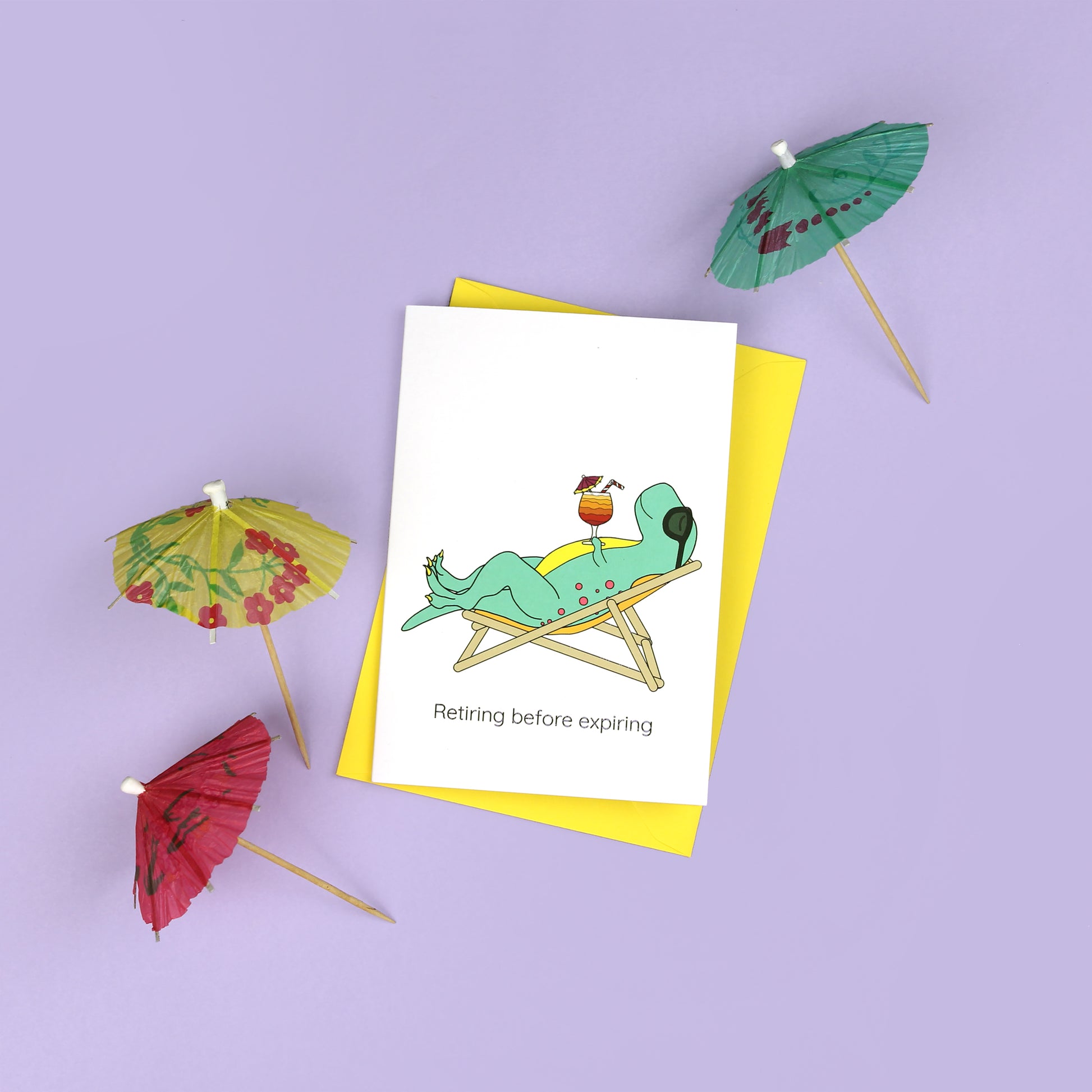 The card features a green T-Rex relaxing on a beach chair wearing sunglasses and sipping a fancy cocktail with a mini umbrella in it. The text below reads 'Retiring Before Expiring '.