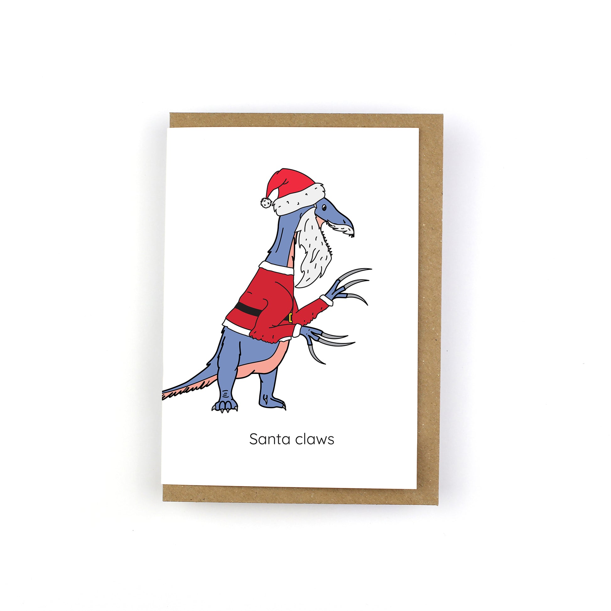 This card features a blueish purple Therizinosaurs wearing a Santa Hat and coat creating the funny pun 'Santa Claws' because of its massive claws! The text 'SANTA CLAWS' is written under the drawing.
