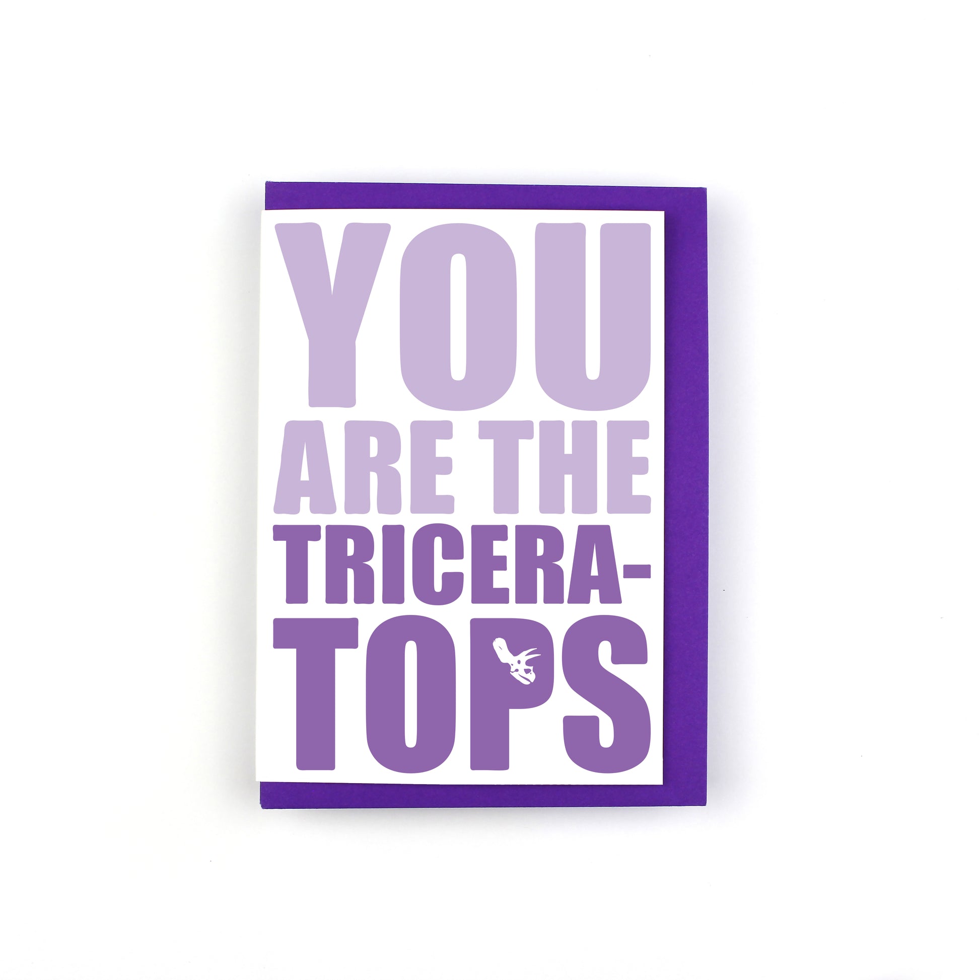 Featuring bold two-tone typography and dinosaur silhouettes. The text reads 'You are the tricera-tops'.