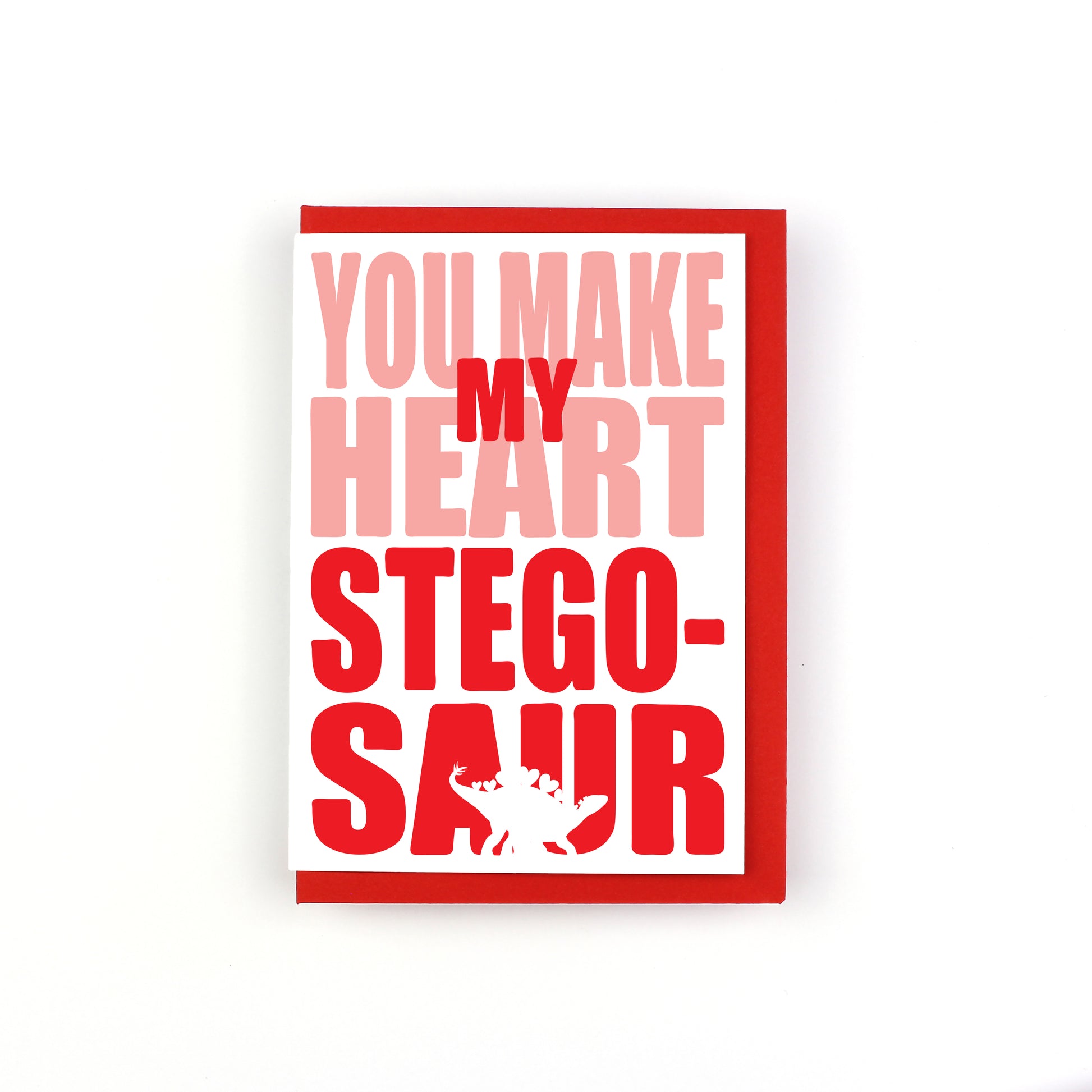 Featuring bold two-tone typography and a stegosaurus with hearts on its back silhouette. The text reads 'You Make My Heart Stego-saur'